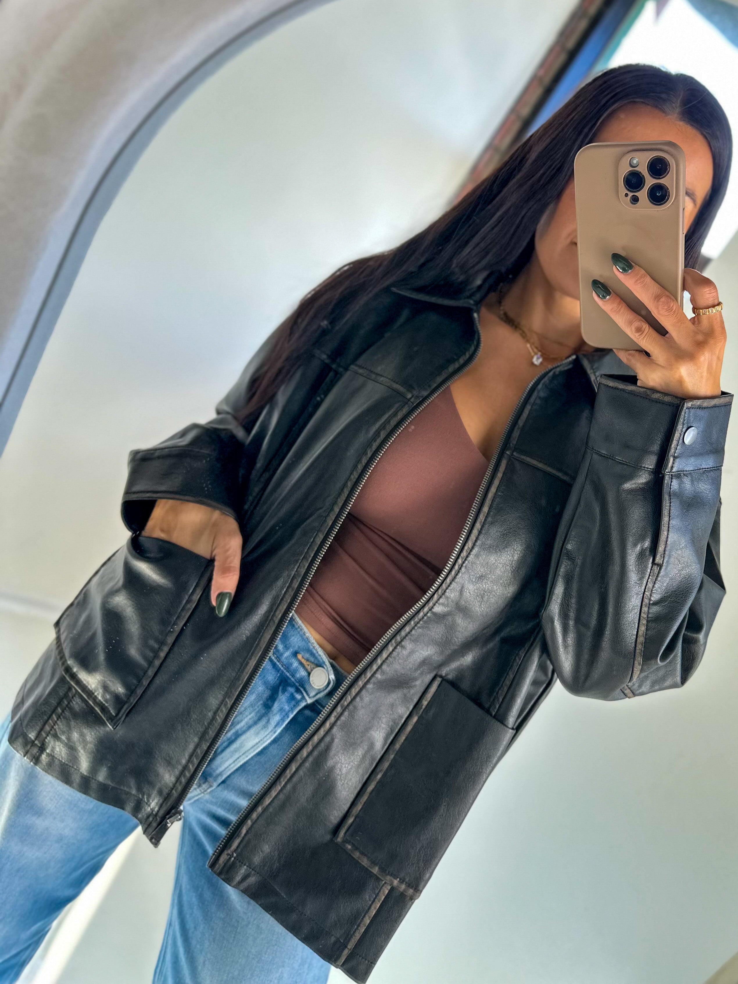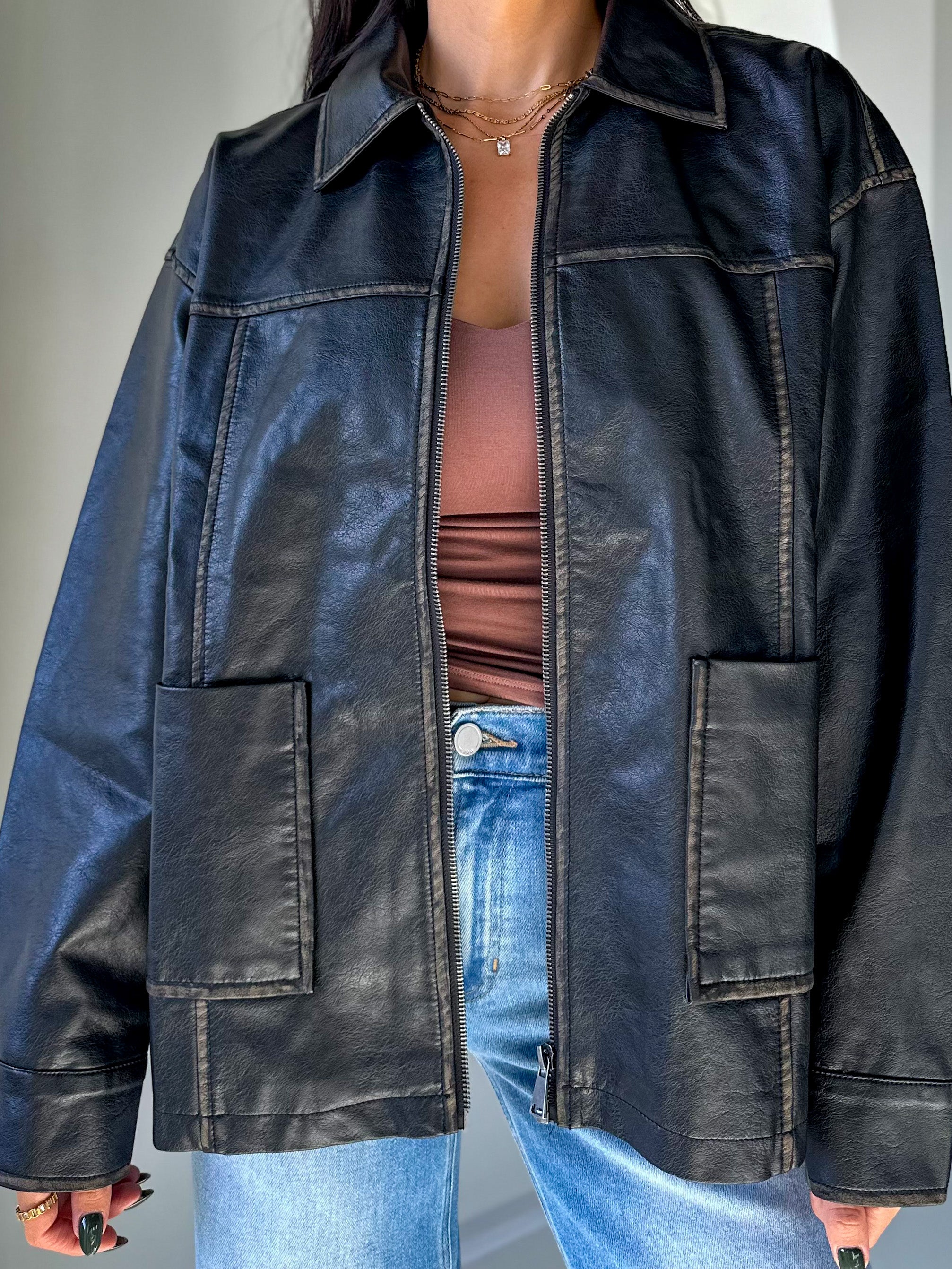 Oversized Washed Leather Jacket - Black