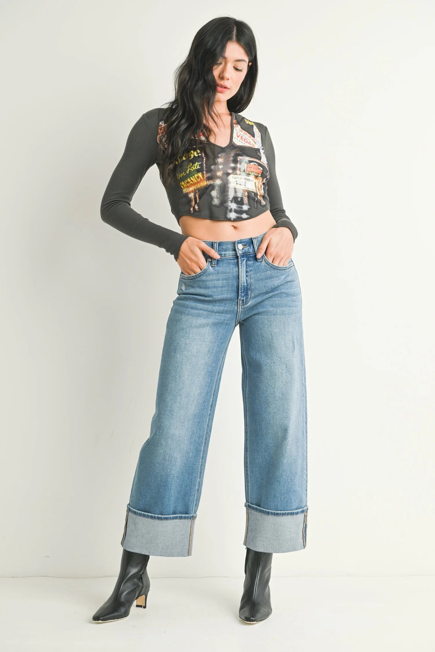 [JBD] Cuffed Slim Wide Leg - Medium Wash