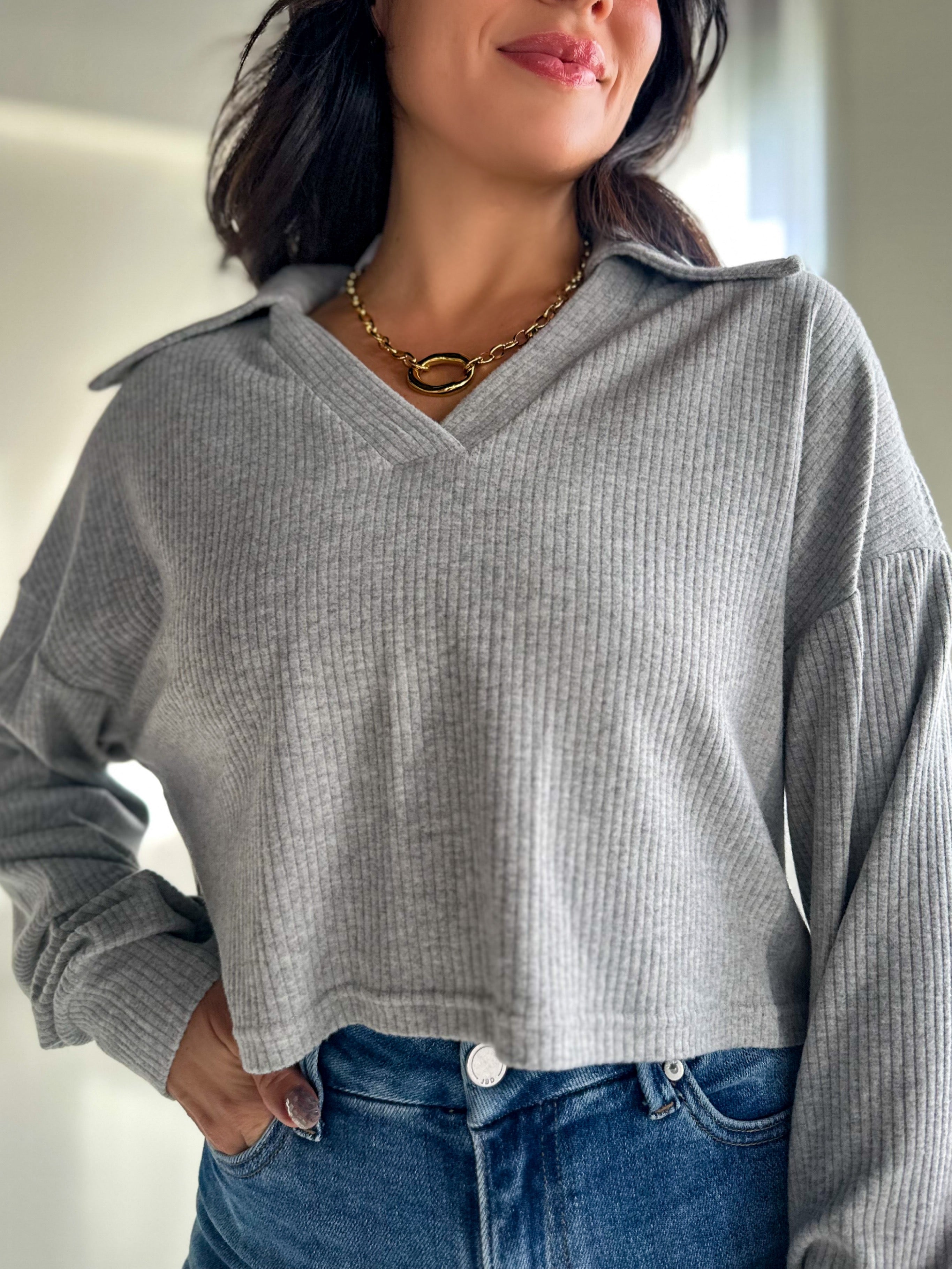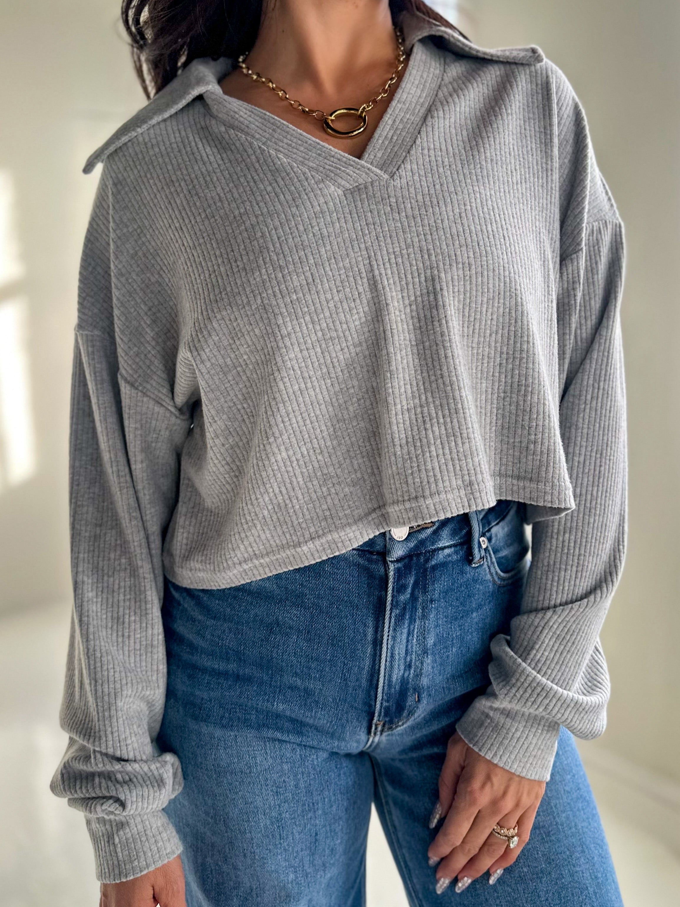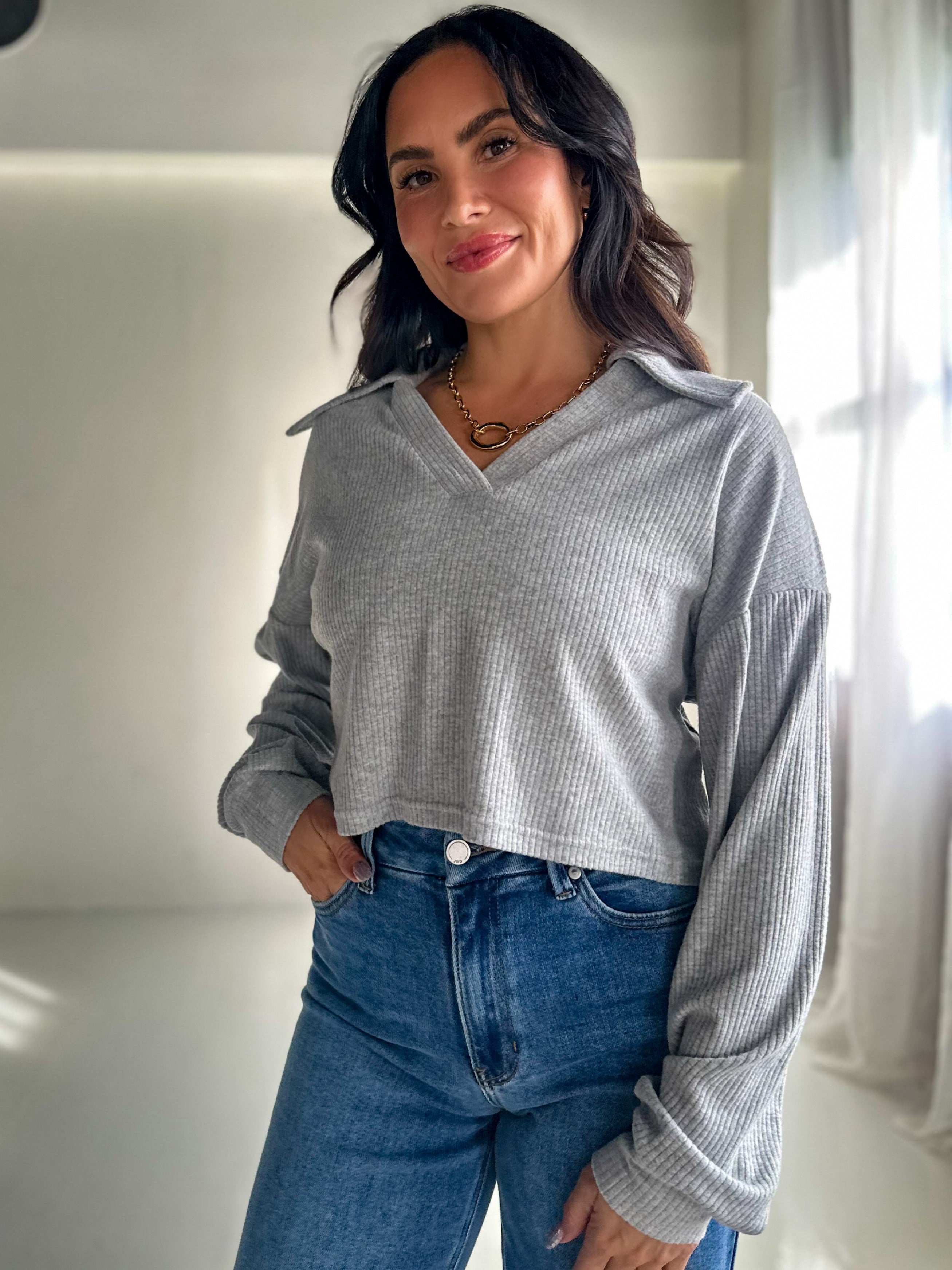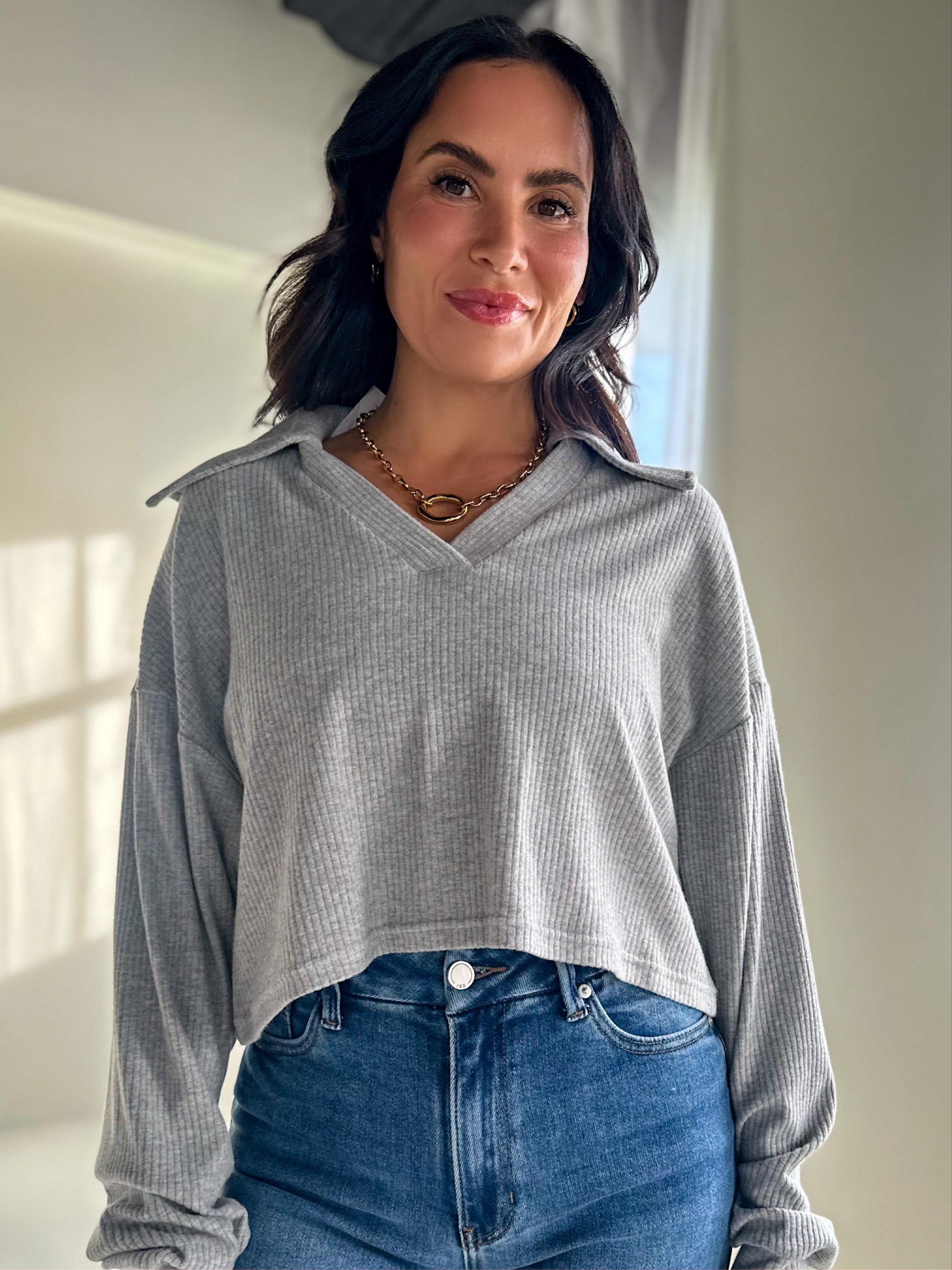 Soft Brushed Ribbed Collared Long Sleeve - Heather Grey