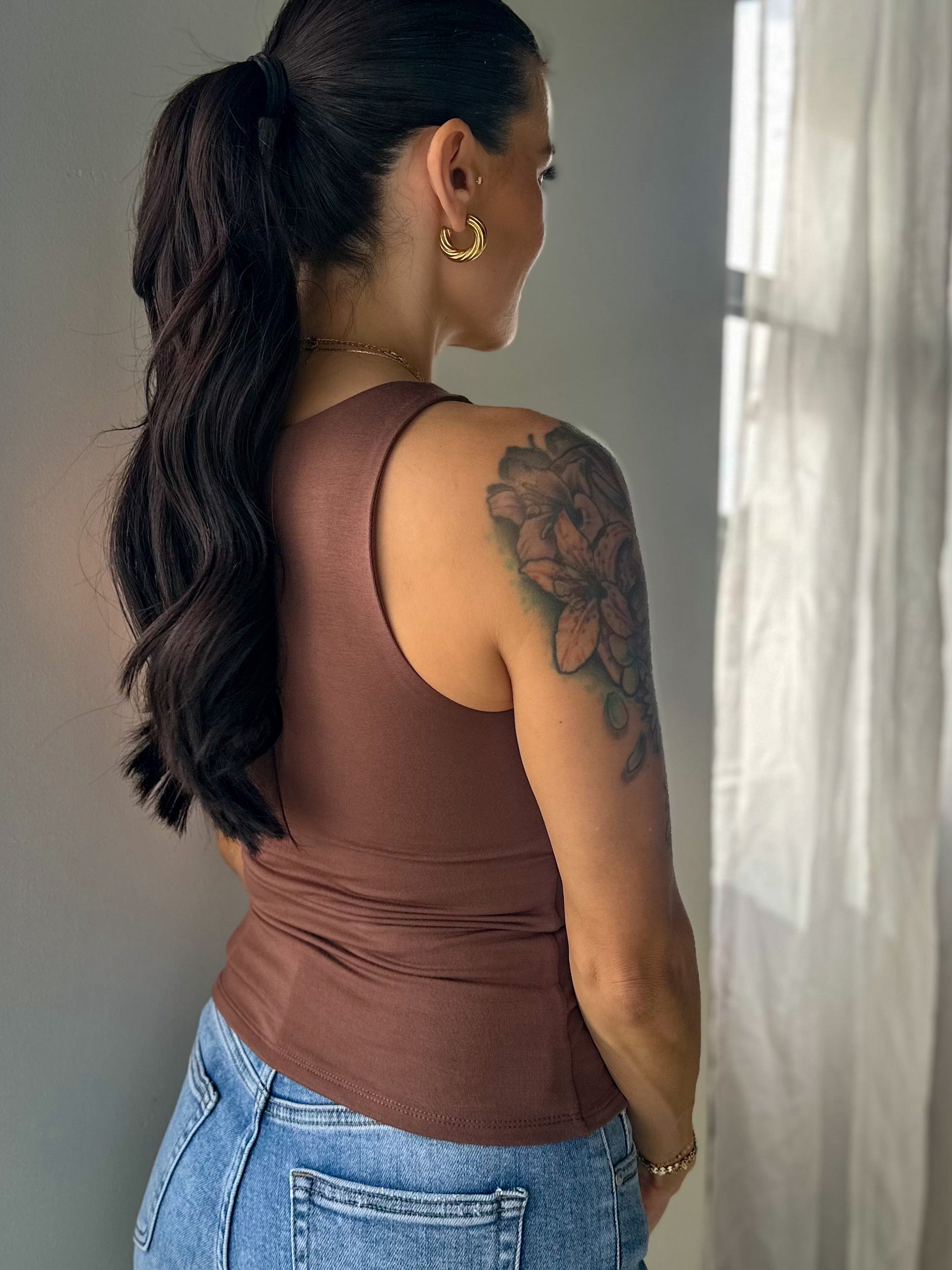'Your New Favorite Tank', V-Neck W/ Full Coverage Back - Chocolate
