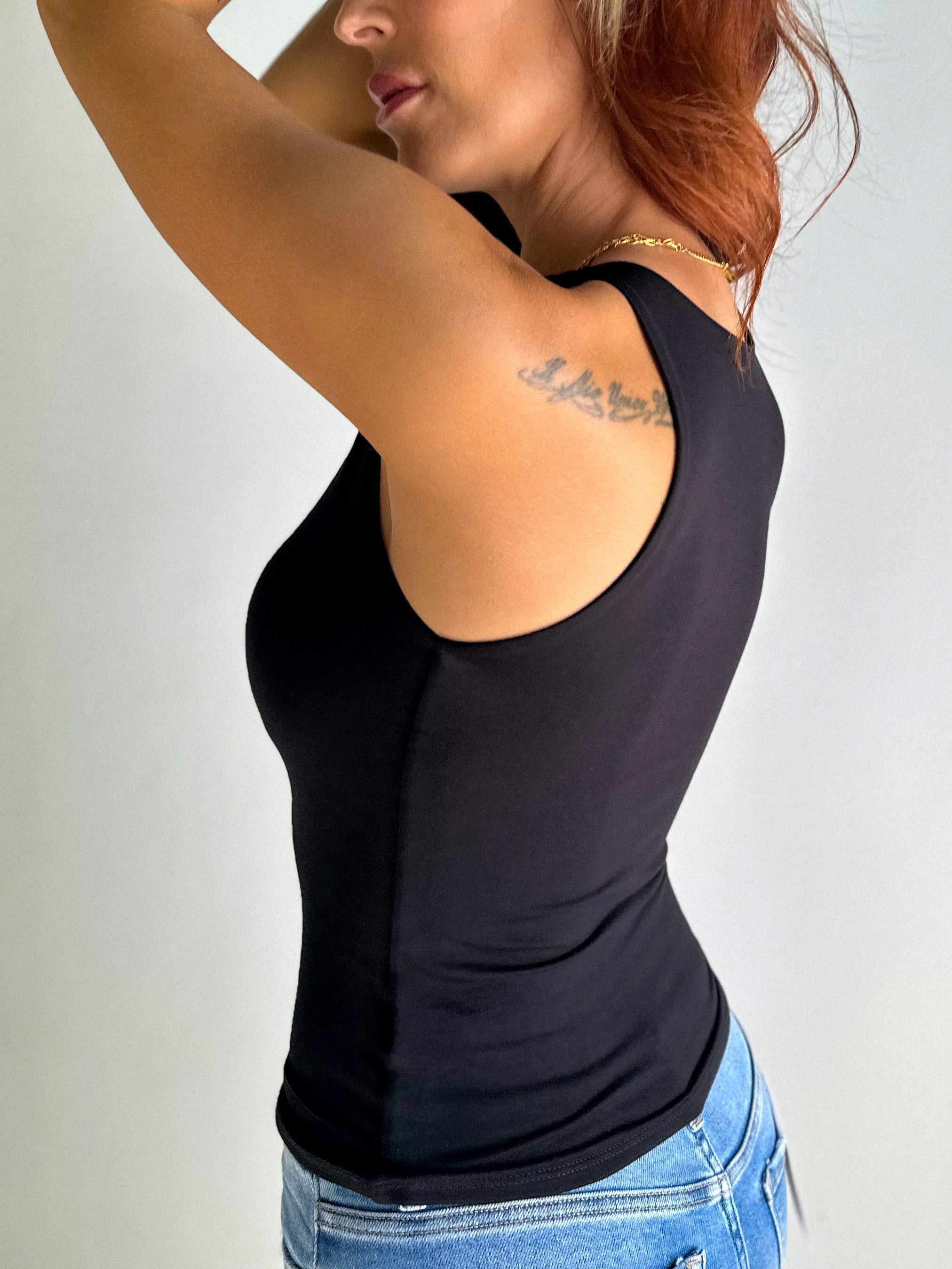 'Your New Favorite Tank', V-Neck W/ Full Coverage Back - Black