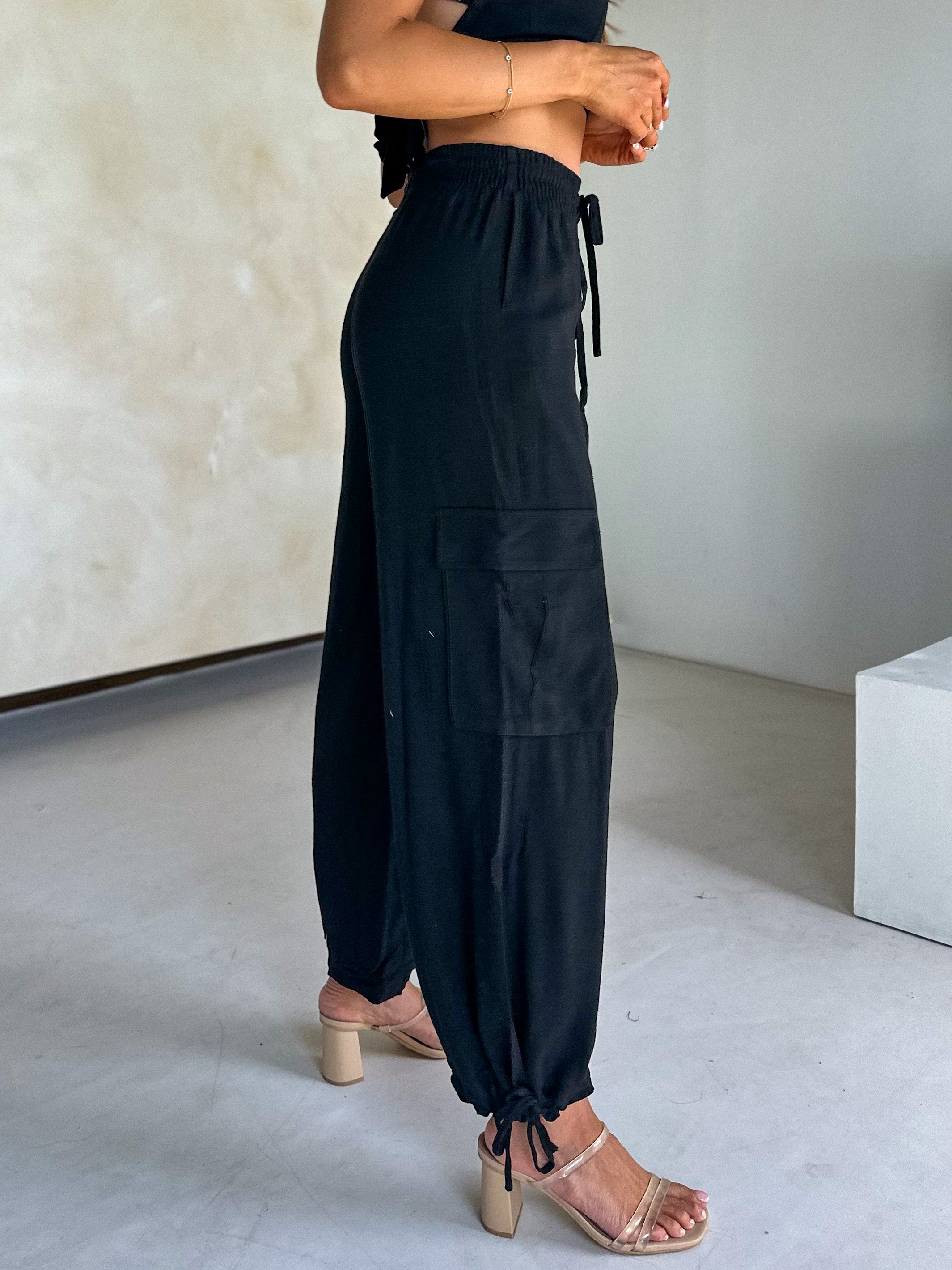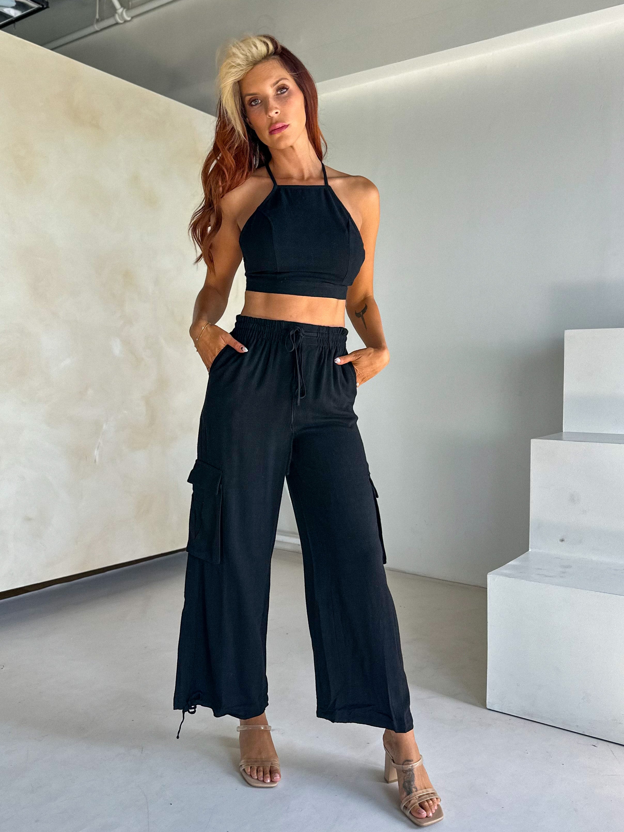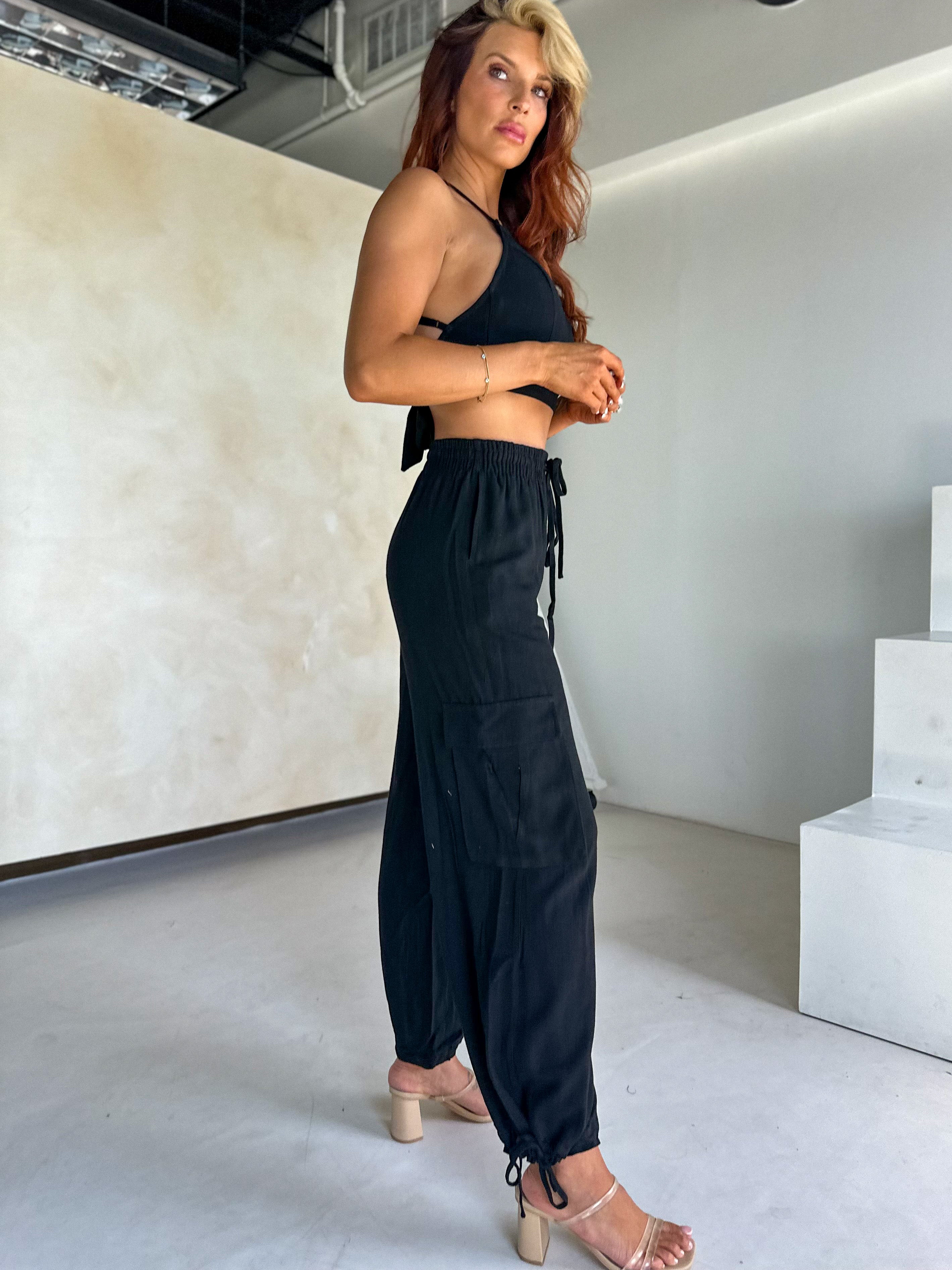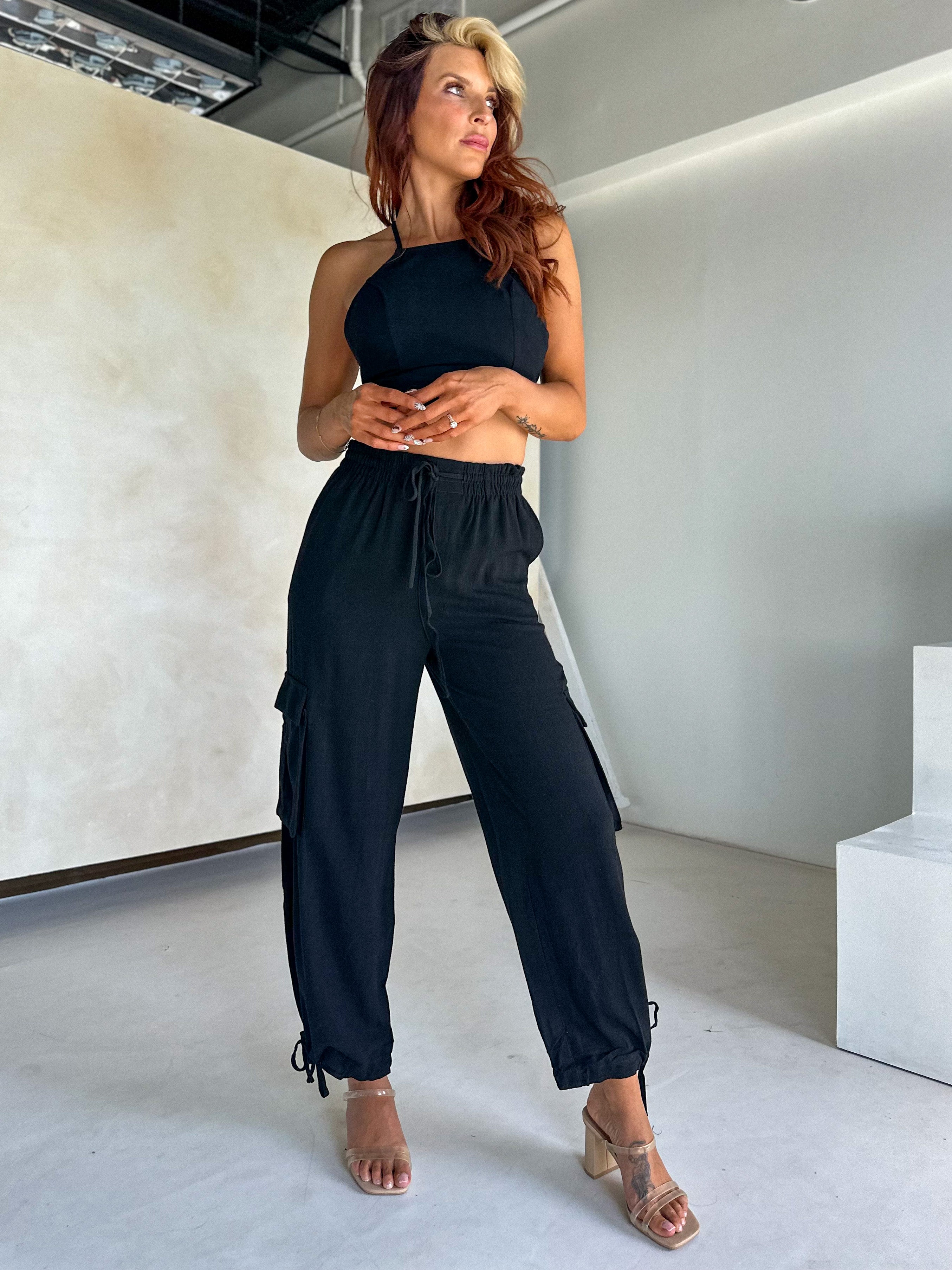 Tie Back Crop Tank With Cargo Pants Set - Black