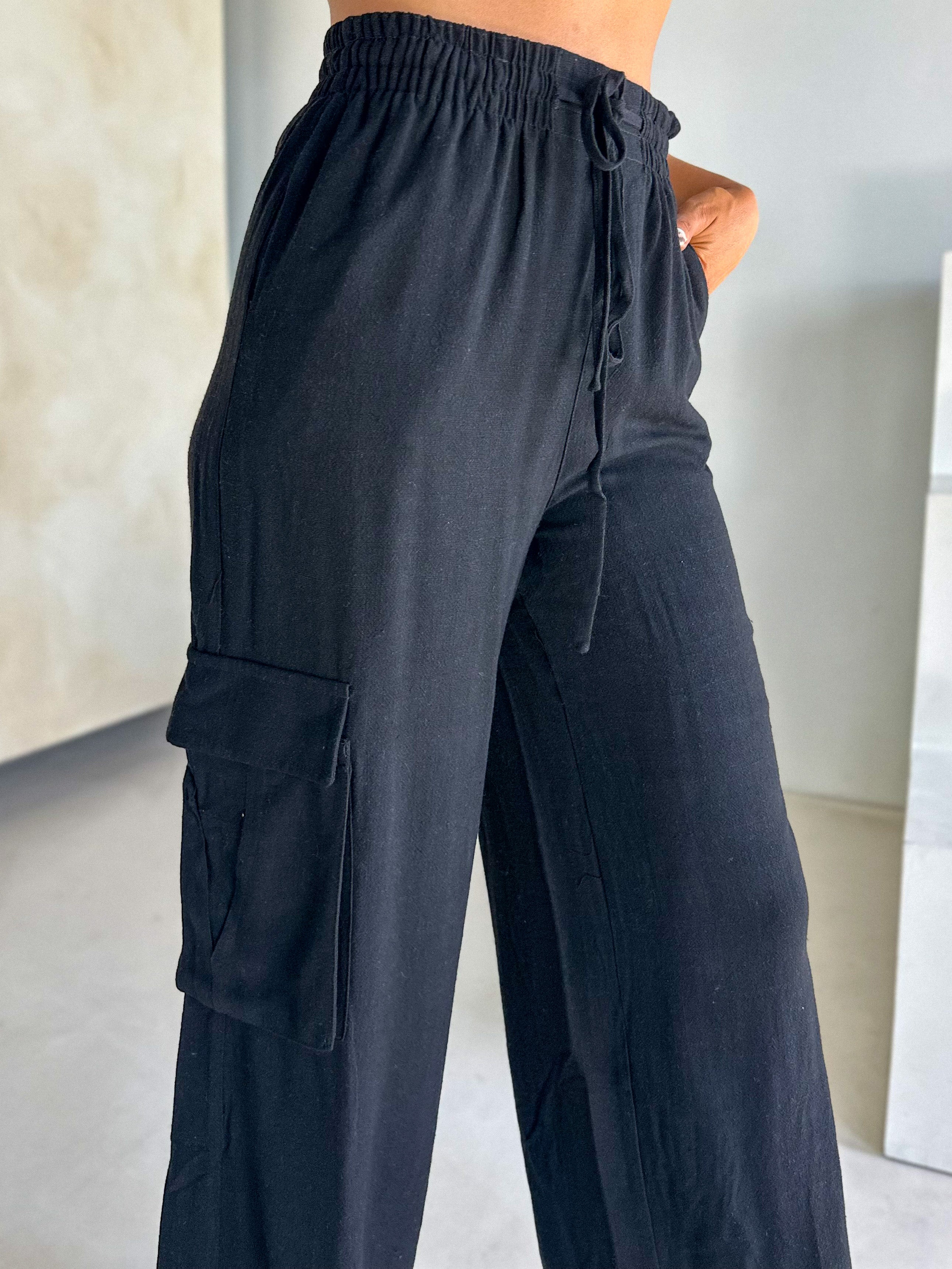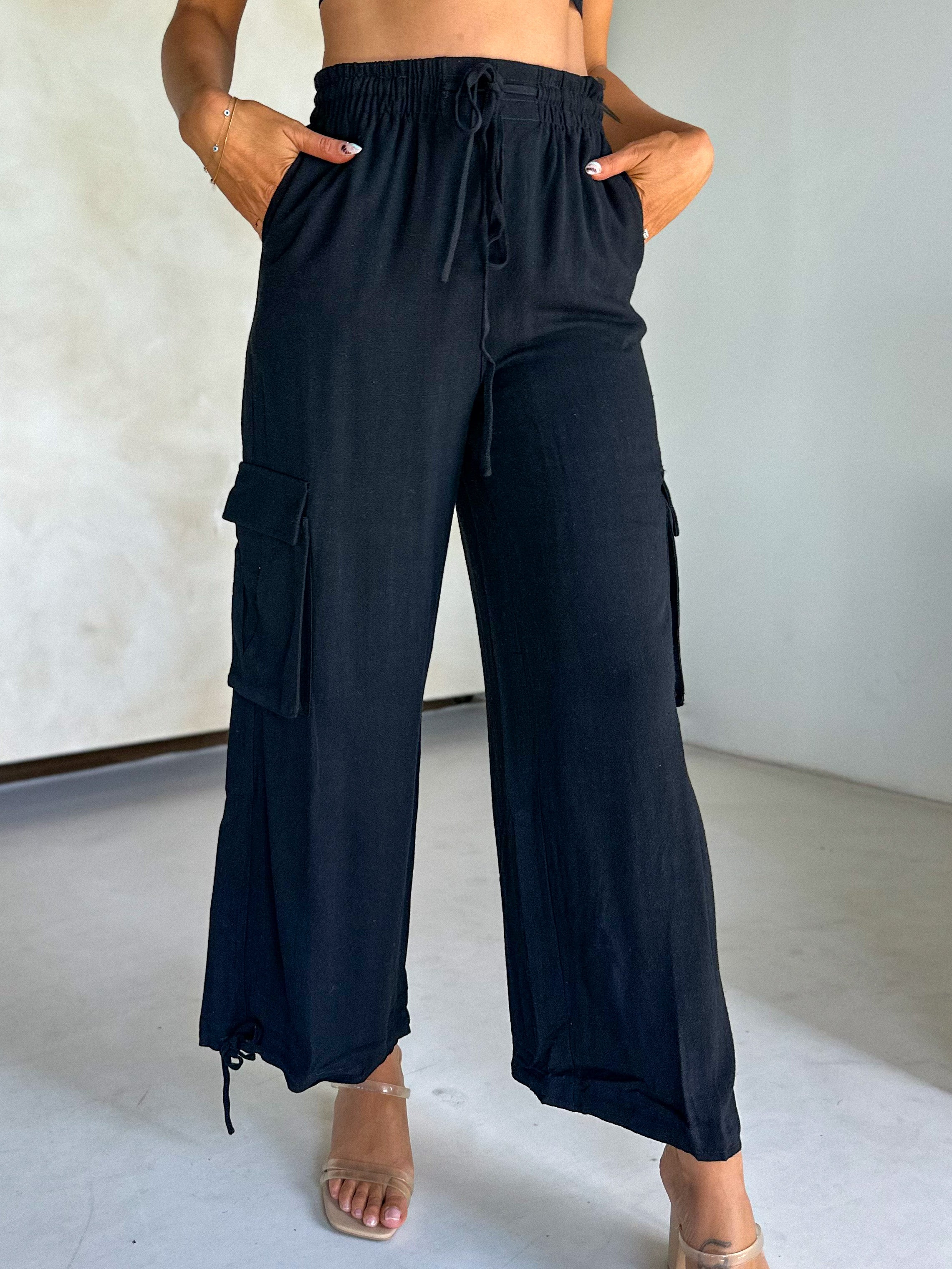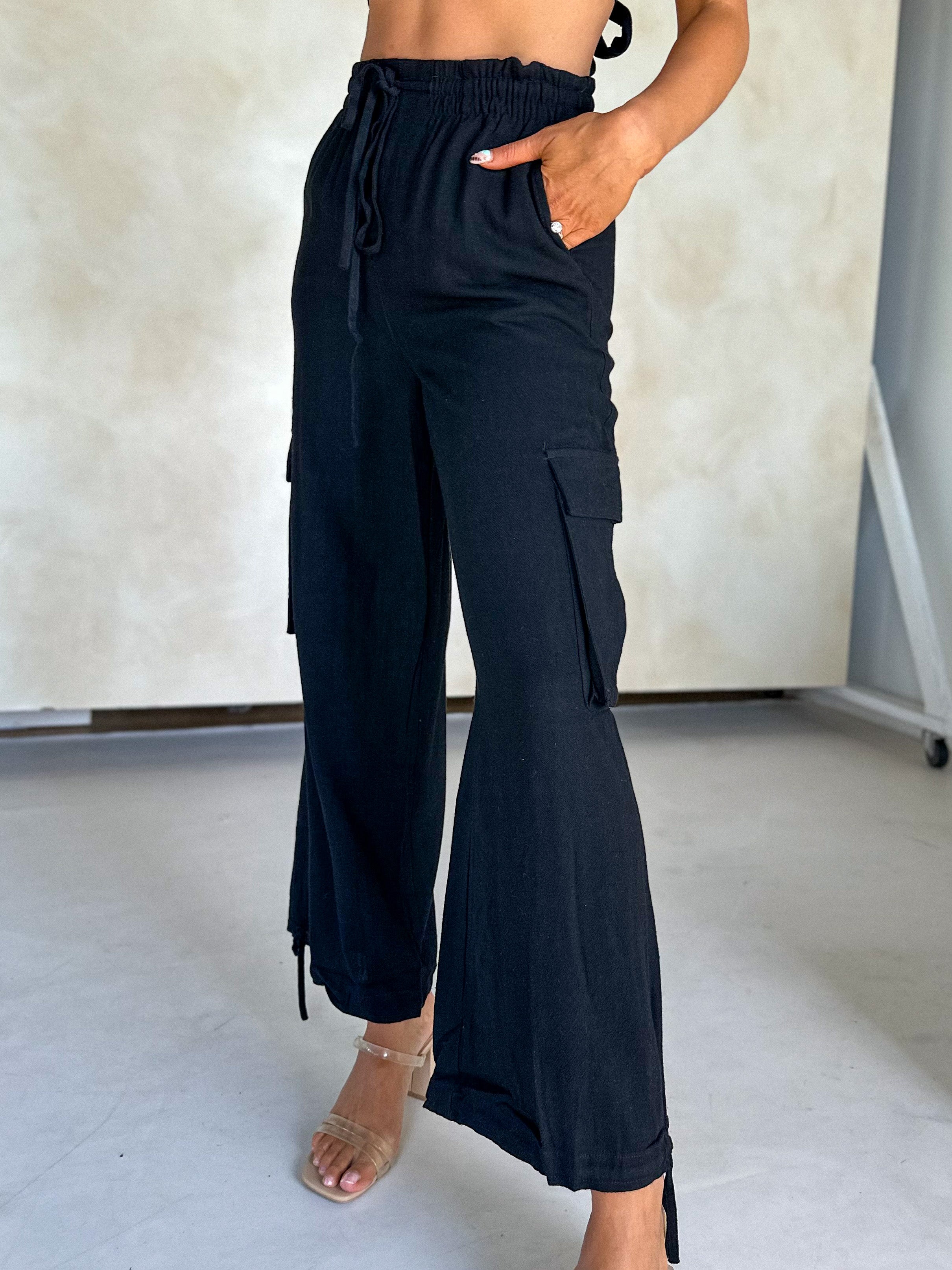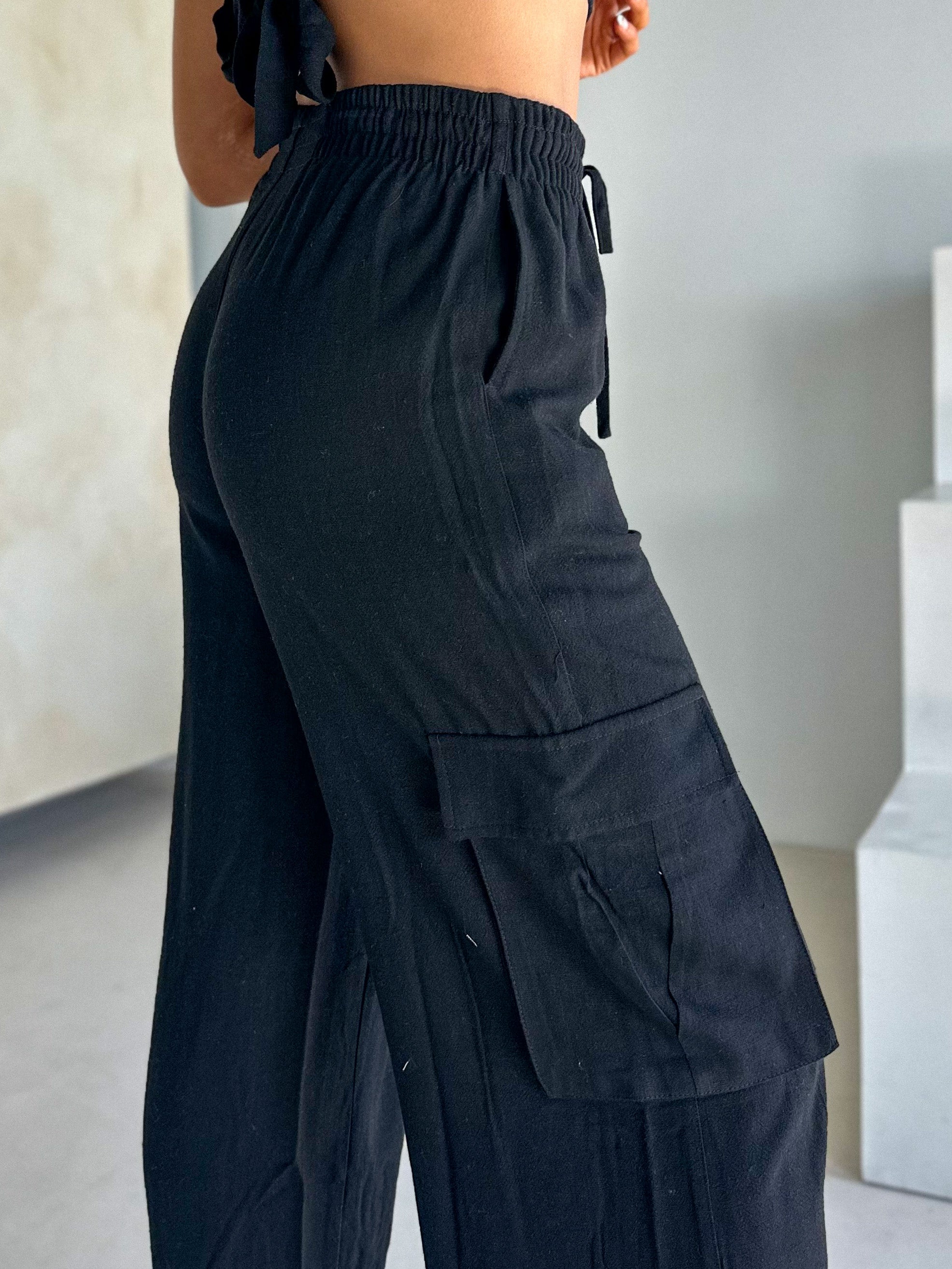 Tie Back Crop Tank With Cargo Pants Set - Black