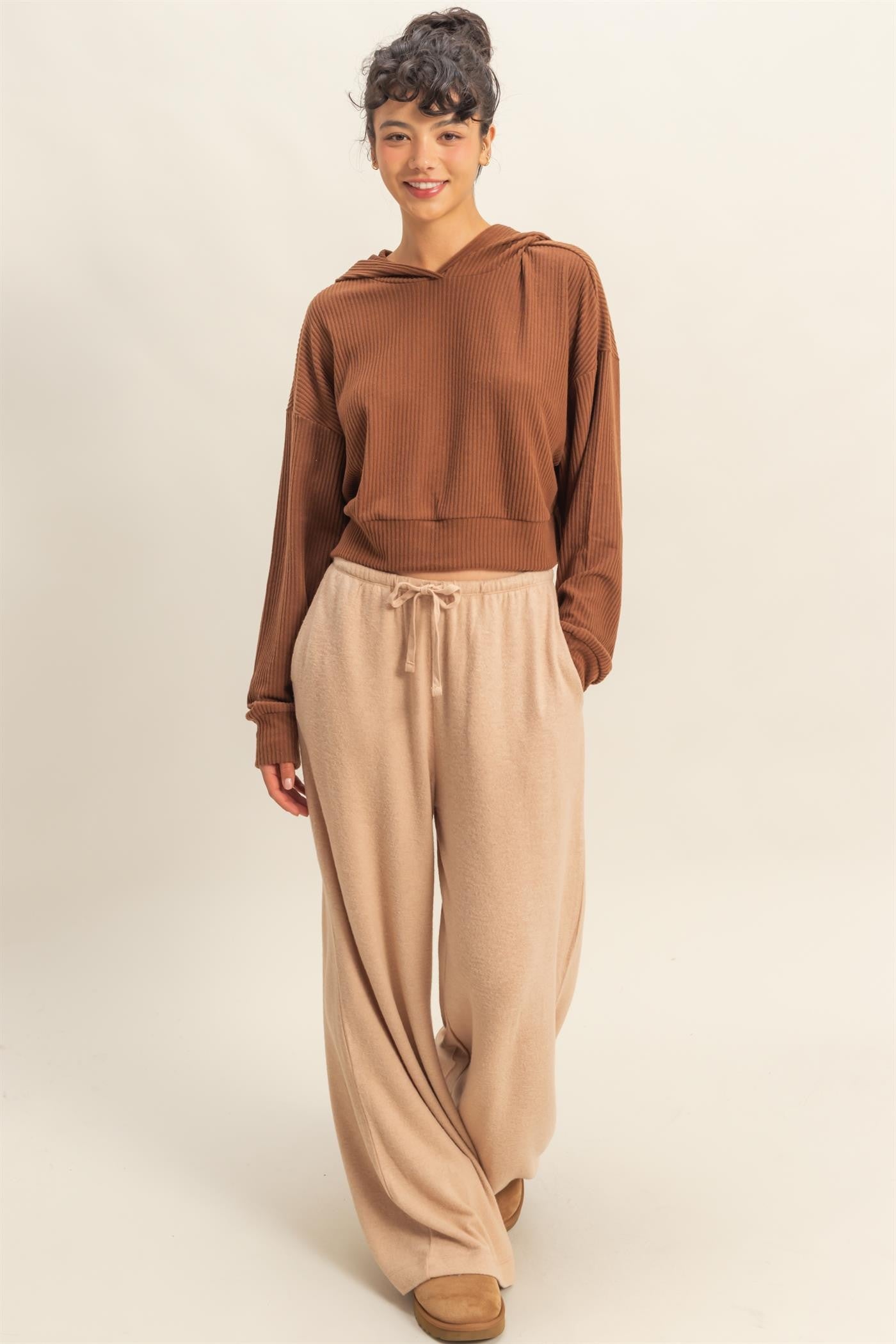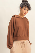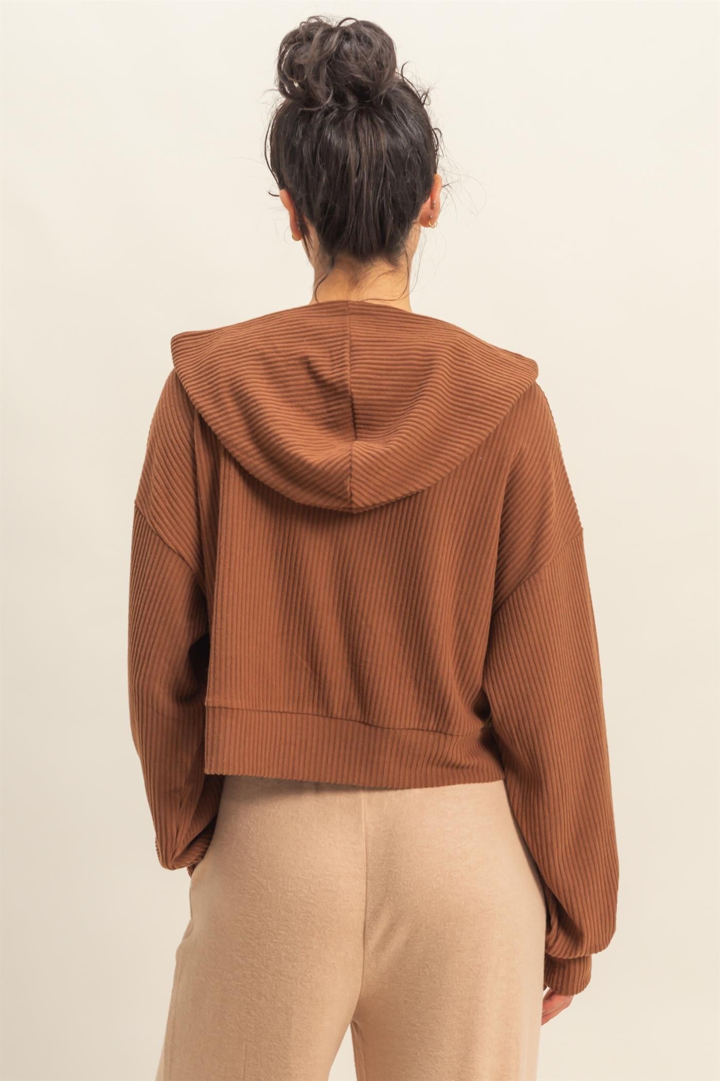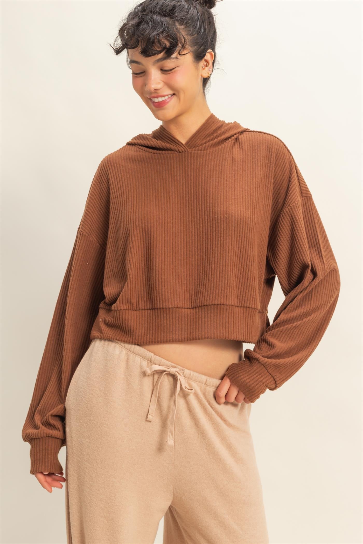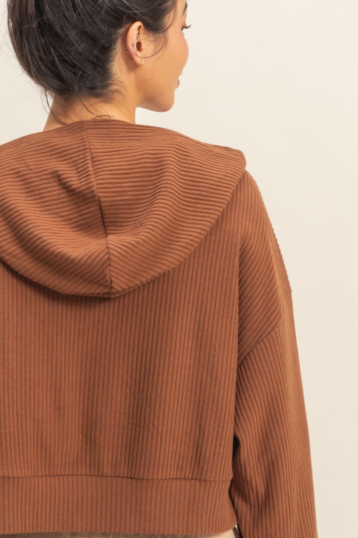 Oversized Cropped Ribbed Hoodie - CHestnut
