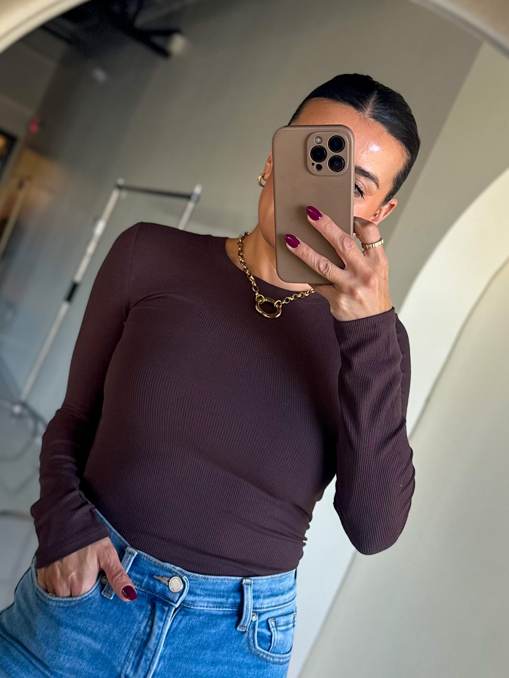 Basic Ribbed Crew Neck Long Sleeve - Espresso