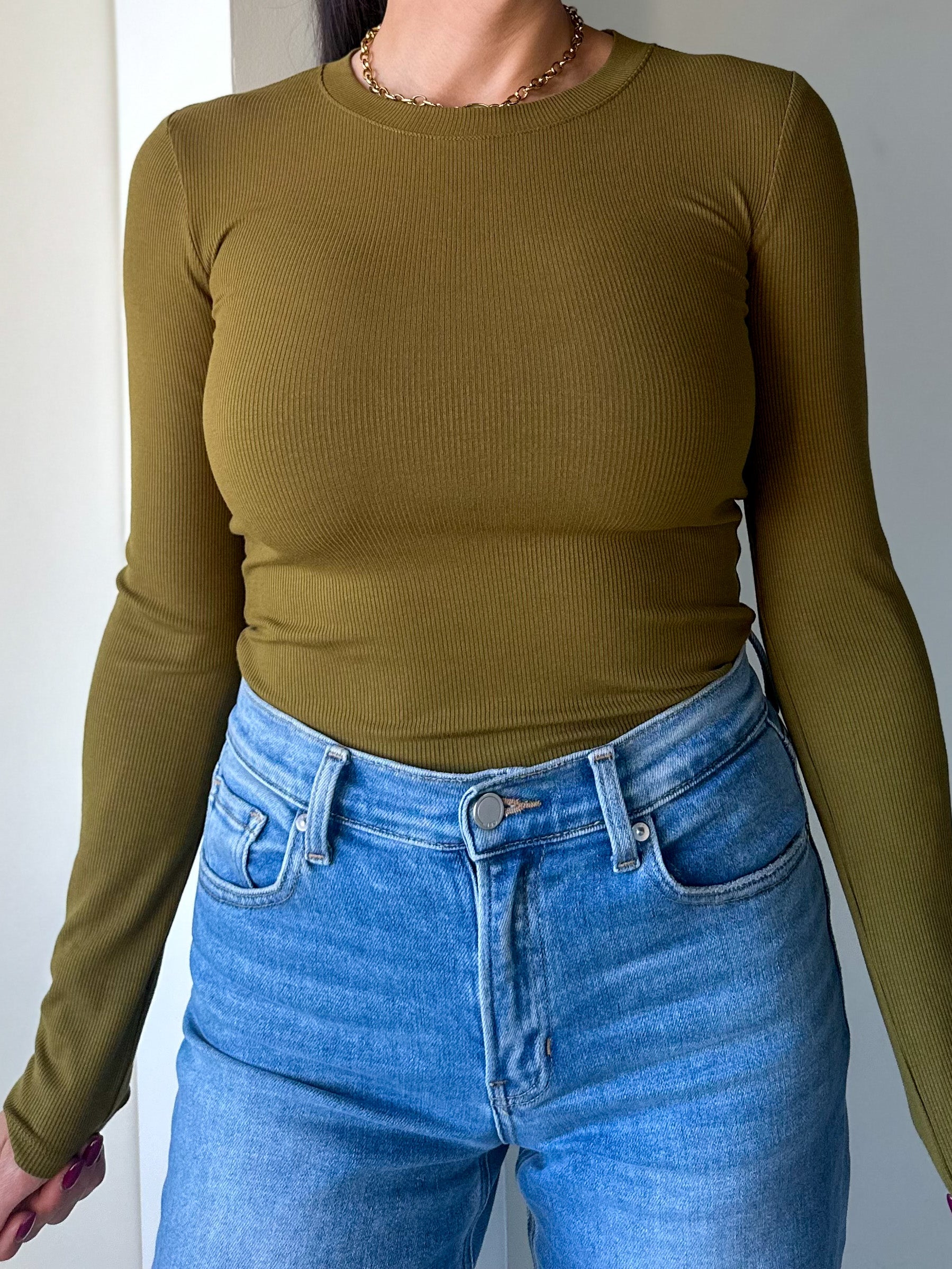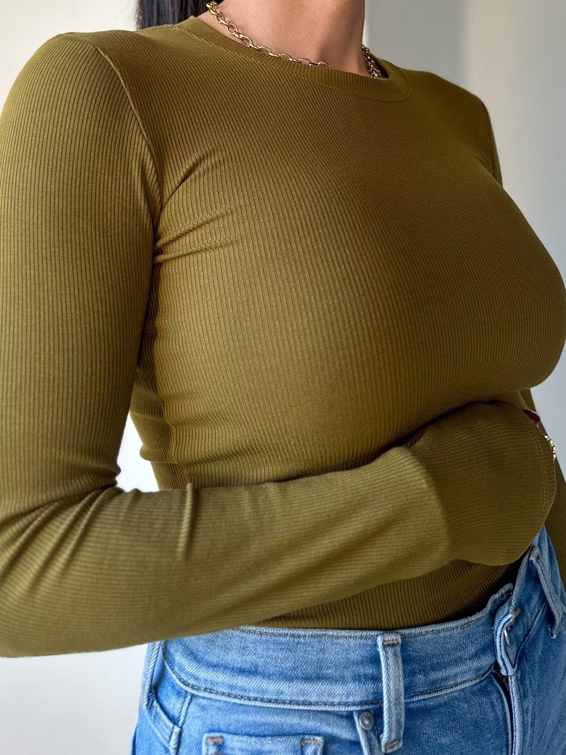 Basic Ribbed Crew Neck Long Sleeve - Olive