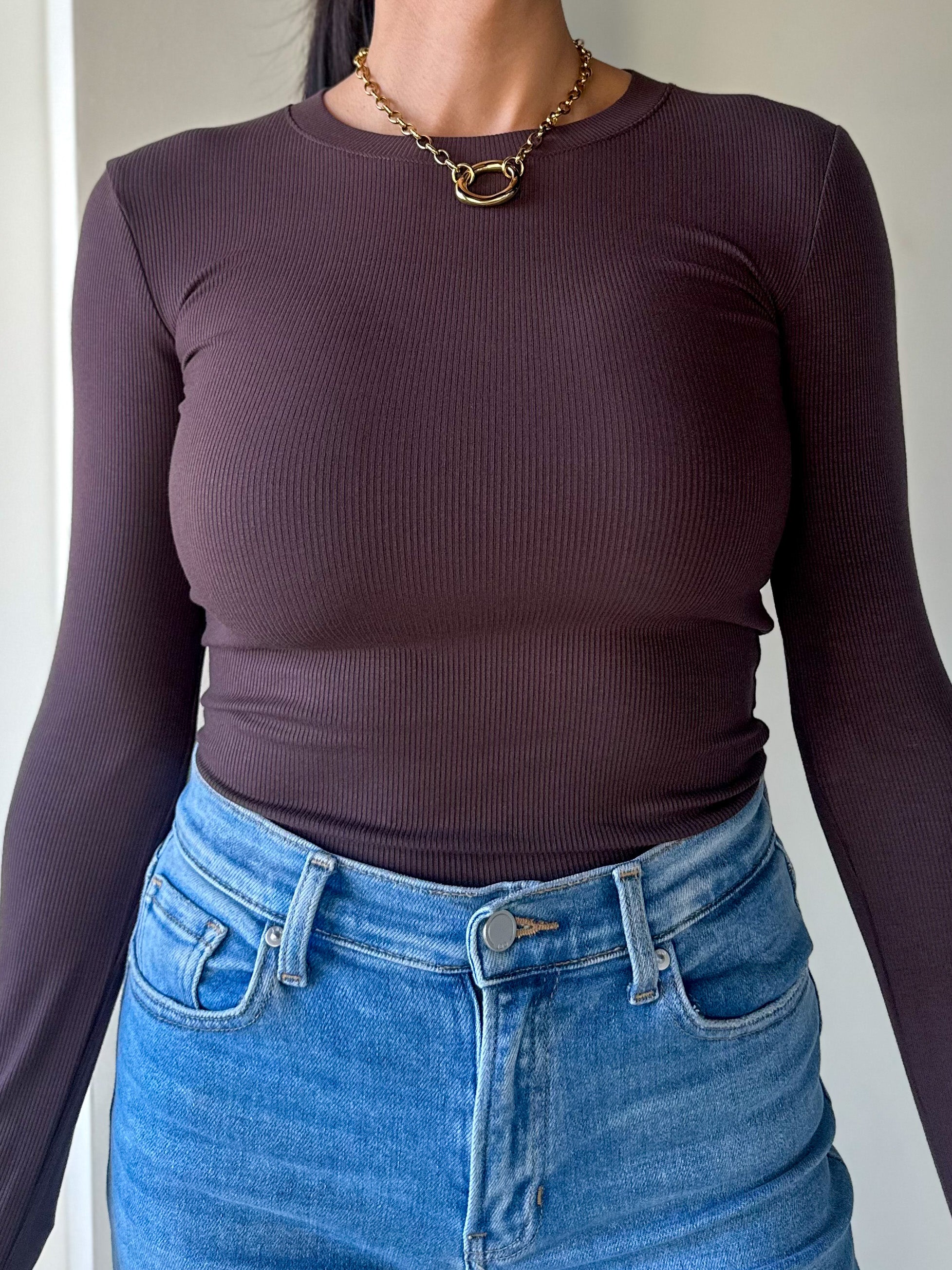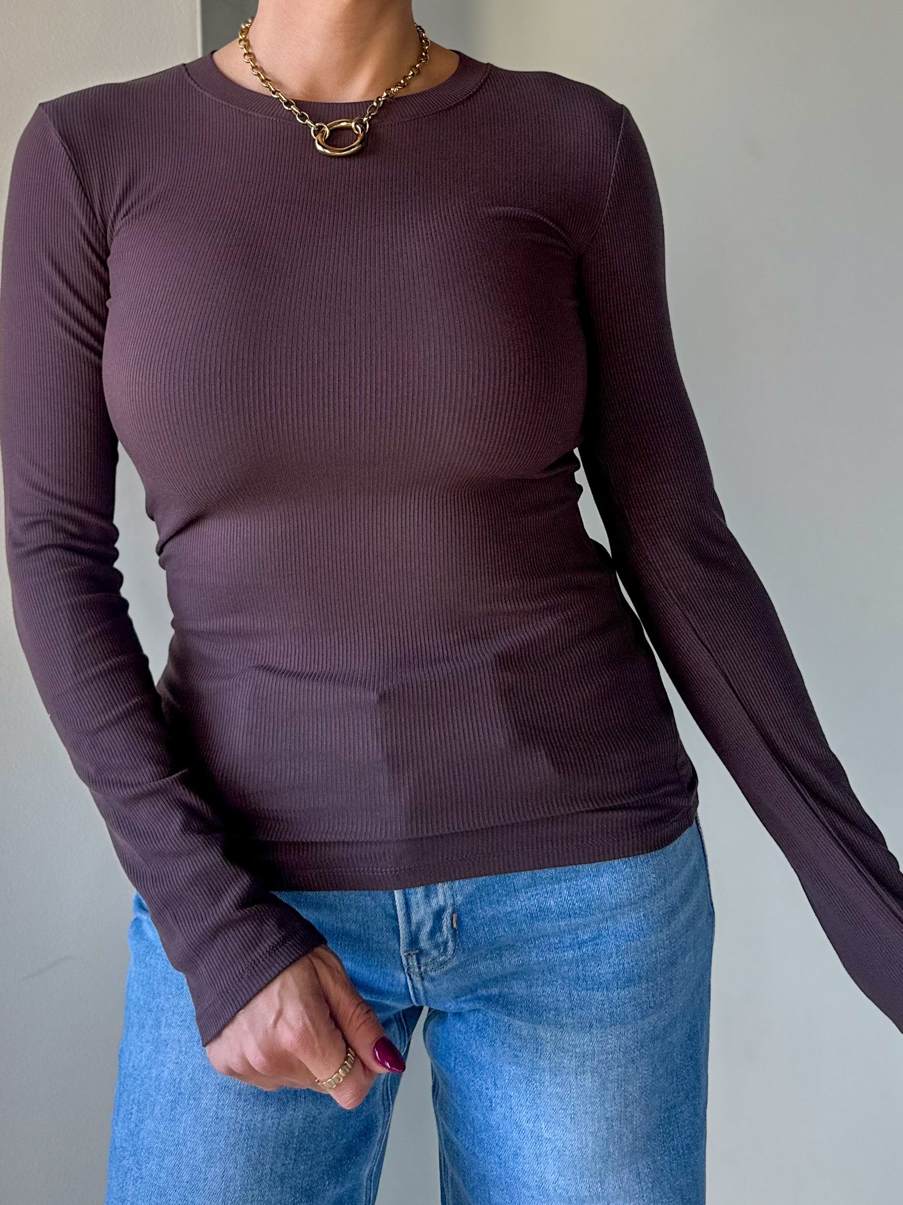 Basic Ribbed Crew Neck Long Sleeve - Espresso