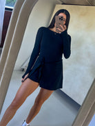Long Sleeve Wrap Tie Front Romper - Black